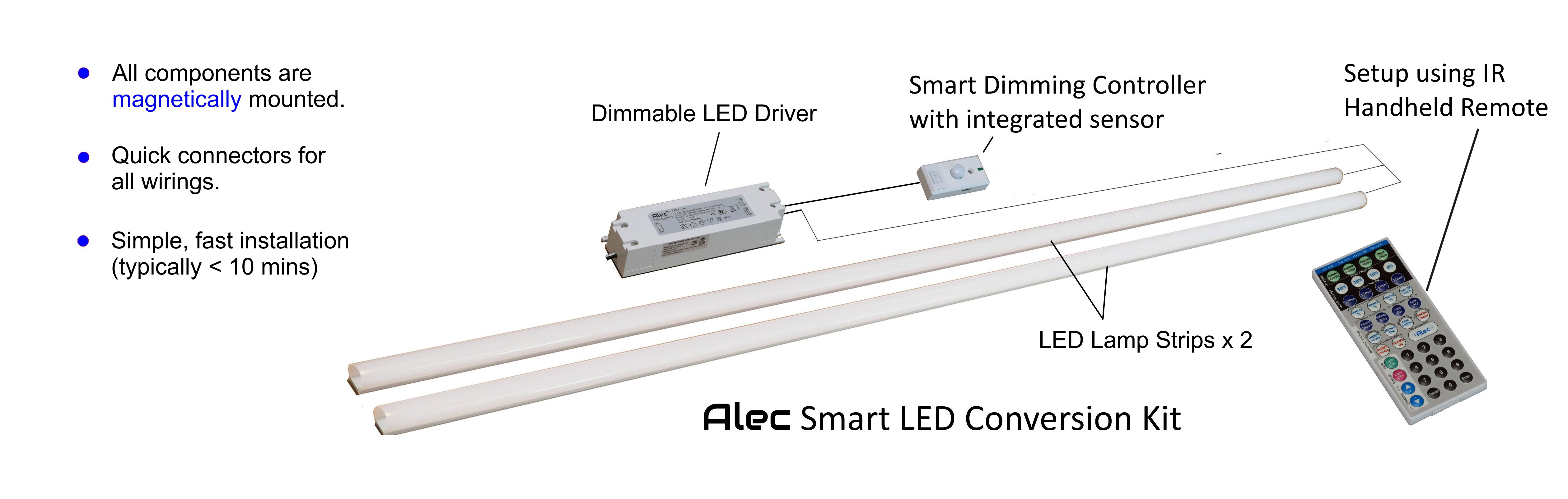 Watch the demo video to see how quick and easy it is to setup and transform your linear fluorescent lights with the Alec Smart LED conversion kit (SLC).